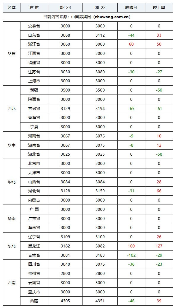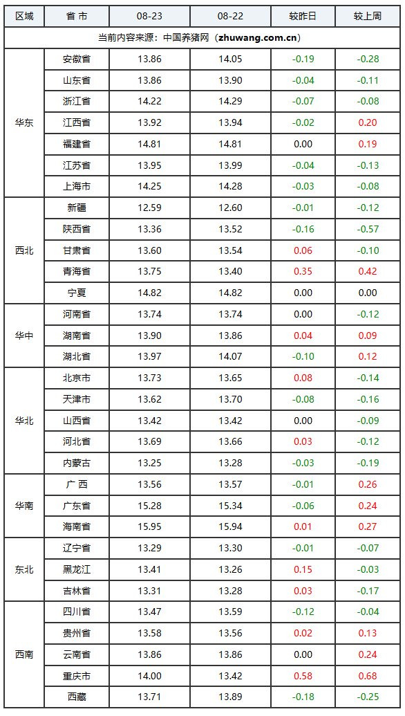 猪价下跌地区(16个):江西省、山东省、天津市、安徽省、江苏省、西藏自治区、上海市、浙江省、陕西省、内蒙古自治区、辽宁省、四川省、新疆维吾尔自治区、湖北省、广西壮族自治区、广东省;下跌区间:0.01-0.19元/公斤;