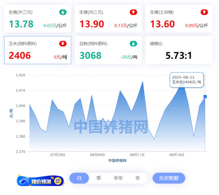 全国(生猪品种:内三元)均价为13.90元/公斤,猪价较昨日上涨0.13元/公斤,环比下跌2.80%,同比下跌32.16%;