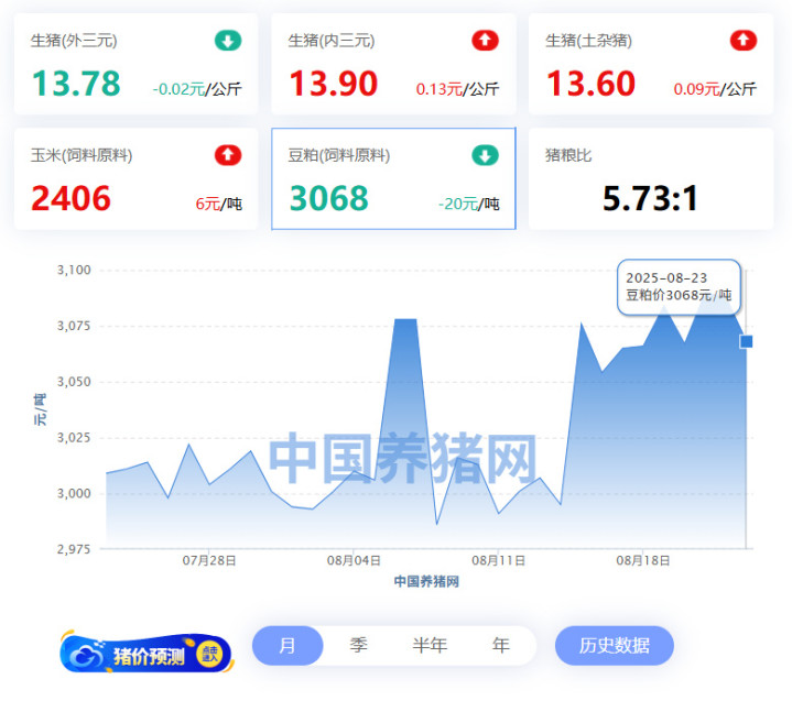 全国(生猪品种:土杂猪)均价为13.60元/公斤,猪价较昨日上涨0.09元/公斤,环比下跌3.68%,同比下跌32.37%;