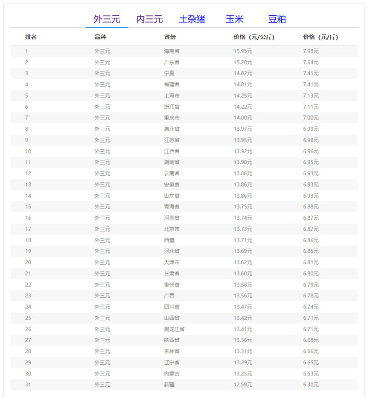 外三元排行后三:新疆维吾尔自治区12.60元/公斤、内蒙古自治区13.25元/公斤、辽宁省13.29元/公斤;