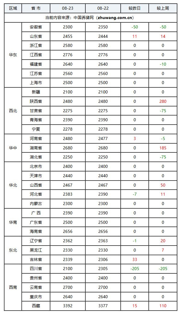 猪价持平地区(5个):福建省、河南省、宁夏回族自治区、山西省、云南省;
