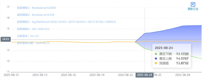 玄田算法是由项目课题组团队原创的非经典逻辑数值聚合理论和不确定性预测方法,构建了基于一致模算子的生猪价格预测模型。该模型采用的聚合函数及一致模相关理论与方法已获得多项国家5自然科学基金和省级自然科学资金资助,并获得多项省级自然科学奖奖项。08月24日预测猪价为13.8732,置信区间在13.1720--14.5767之间。08月25日预测猪价为13.8352;08月26日预测猪价为13.8233。