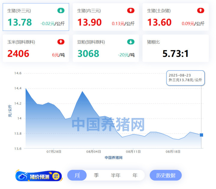 全国(生猪品种:外三元)均价为13.78元/公斤,猪价较昨日下跌0.02元/公斤,环比下跌4.31%,同比下跌33.52%;